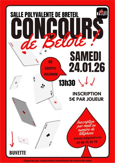Le samedi 24 janvier à partir de 13h30, l’association breteillaise de tennis de table organise un concours de belote à la salle polyvalente de Breteil.